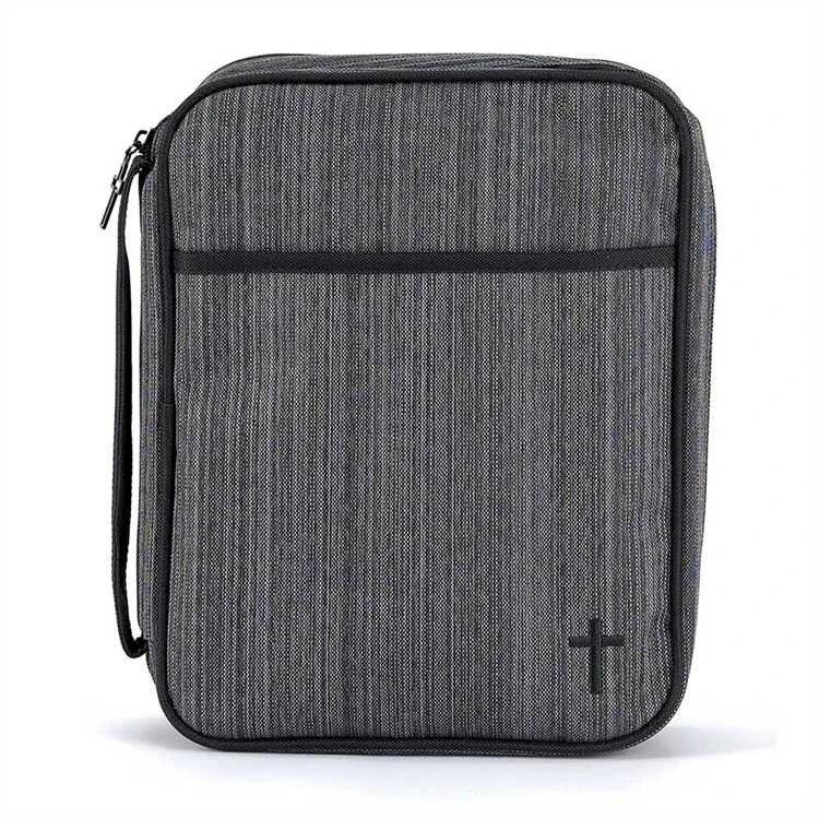 Black and Silver Micro-Stripe with Dark Trim- Corrugated Box Insert Front Pocket – Black Cross Zipper Pull – Large 7 1/8 inches Wide by 2 inches Diameter by 10 1/4 inch HeightMade of durable, reinforced polyester fabricBible cover measures approximately 2 x 8.5 x 10.5 inchesFull zipper closure with coordinating zipper pull; Carrying handle for easy travelLays flat when open to fully view bible without removingPerfect when on-the-go to church, bible study and classes