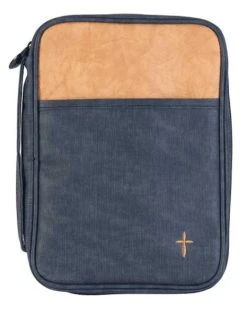 This handsome Bible cover is a textured black, with tan accent above the open front pocket. Tan area has an exquisite crinkle texture with the look of