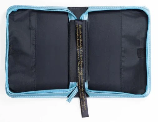 Each fashion Bible cover has a wrap-around zippered closure, spine carrying handle, and a sewn-in ribbon bookmark featuring Joshua 1:8. Scripture He