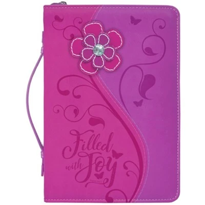 Filled With Joy Psalm Daisy Bible Cover features butterfly design with daisy bloom and rhinestone at the top; Sentiment reads “Filled with joy. Psalm 126:3″Cover is made of polyurethane faux leather with floral hot pink finishBible cover is size x-large and measures approximately 11 x 8 x 2 inchesEmbellished with applique and hot stamp features; Includes zippered closure and spine carrying handle