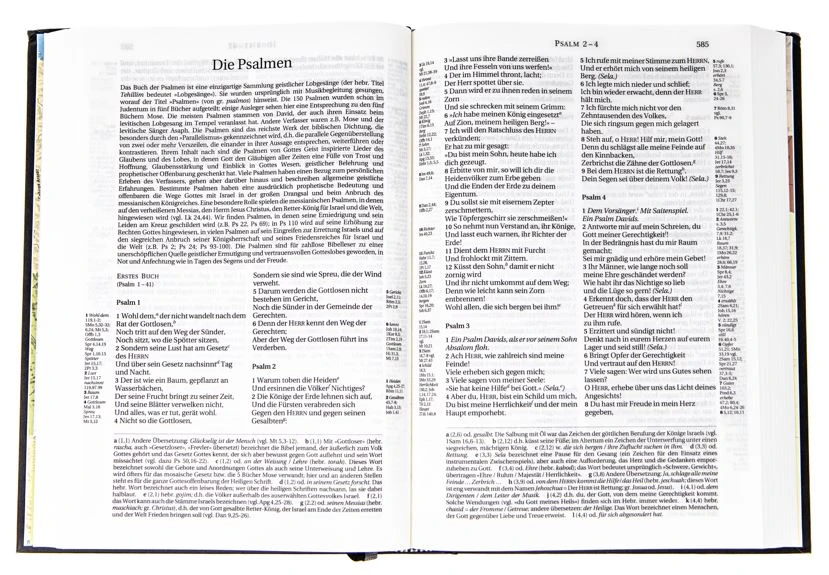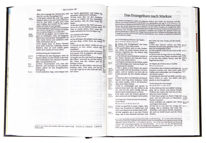 Diese volkstümliche, gut verständliche Bibel ist bekanntfür ihre Treue zum Urtext und ihre seelsorgerliche Sprache. Sie eignetsich – je nach Ausgabe – hervorragend sowohl als missionarische Bibel als auchals Studienbibel. Zahlreiche Erklärungen biblischer Wörter inFußnoten sowie ein ausführlicher Anhang mit Sach- undWorterklärungen, übersichtstabellen und Karten bieten Hilfen fürden Bibelleser.This popular, understandable Bible is well knownfor their loyalty to the original text and their pastoral language. It is suitabledepending on the edition – excellent as both a missionary Bible andas a study bible. Numerous explanations of biblical words inFootnotes and a detailed appendix with factual andWord explanations, overview tables and maps offer help forthe Bible reader.