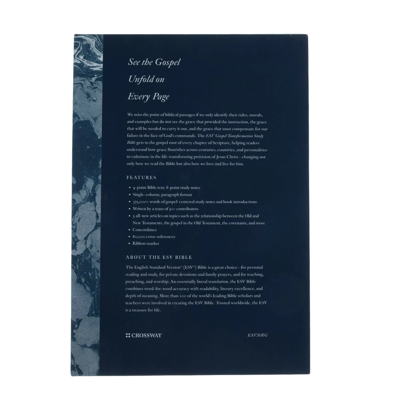 The ESV Gospel Transformation Study Bible is designed to help readers see Christ in all of Scripture, and grace for all of life.It features book introductions, gospel-centered study notes, and a series of all-new articles?written by a team of over 50 pastors and scholars. This content explains passage-by-passage how Godβs redemptive purposes culminate in the gospel and apply to the lives of believers today.Readers will be challenged to see how the message of the gospel transforms sinners from the inside out. Over 375,000 words of gospel-centered study notesIntroduction that outlines specific uses for the BibleUpdated design and typesetting based on the original ESV Gospel Transformation Bible released in 2013Includes 5 new articles on topics such as the relationship between the Old and New Testaments, the gospel in the Old Testament, the covenants, and moreBook introductionsLifetime guaranteeConcordance80,000 cross-referencesRibbon markerSmyth-sewn bindingSize: 6.125″ x 9.125″9-point Bible text; 8-point study notes2,096 pagesSingle-column format