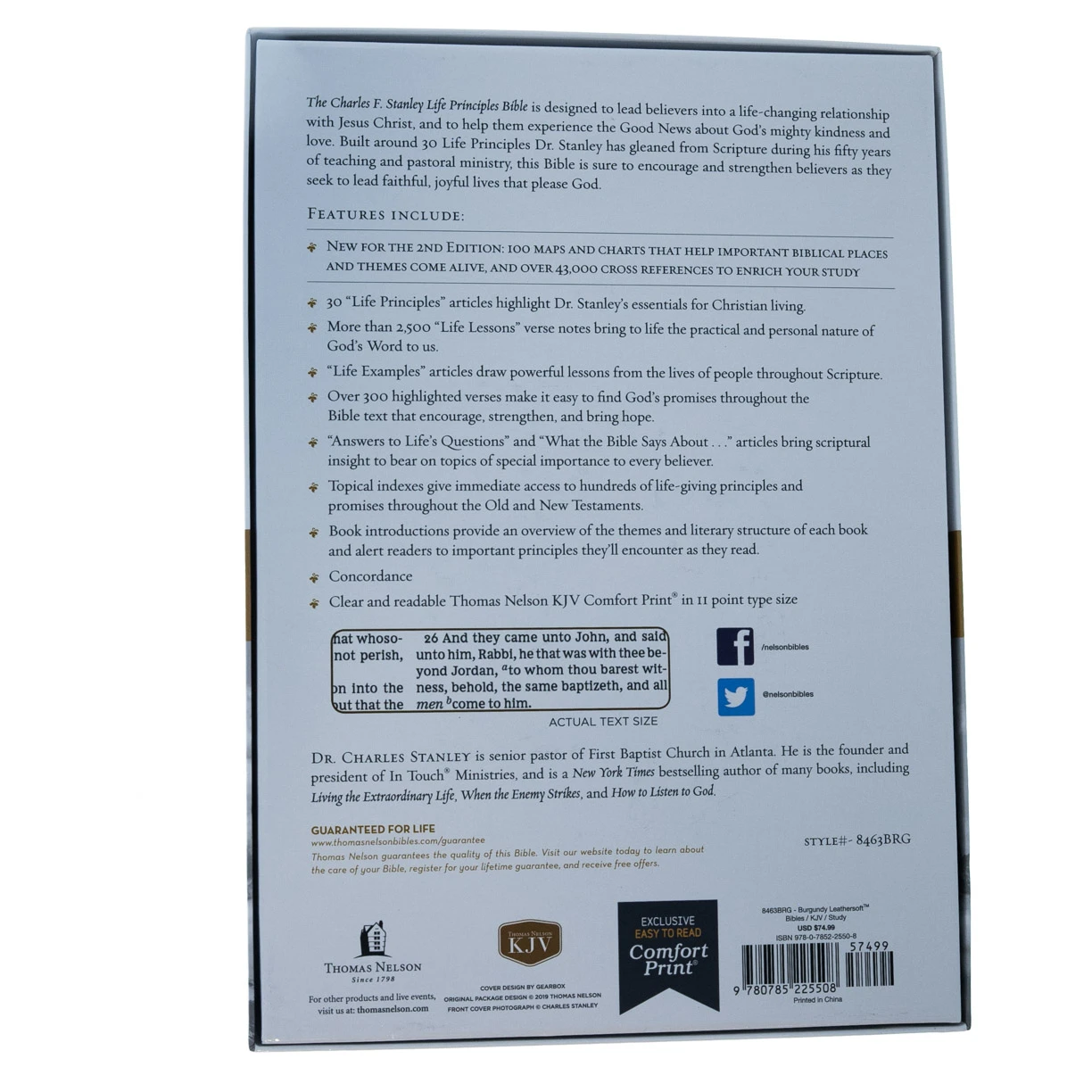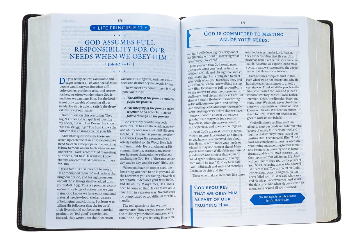 The Charles F. Stanley Life Principles Bible is designed to lead believers into a life-changing relationship with Jesus Christ, and to help them experience the Good News about God’s mighty kindness and love. Built around 30 Life Principles Dr. Stanley has gleaned from Scripture during his fifty years of teaching and pastoral ministry, this Bible is sure to encourage and strengthen believers as they seek to lead faithful, joyful lives that please God.With over one million Life Principles Bibles sold to date, the updated second edition is the best way to experience this bestselling classic—with a completely new design featuring Thomas Nelson’s KJV easy-to-read Comfort Print® typeface, 100 specially designed maps and charts that bring biblical places and themes to life, and over 43,000 cross references to enrich your study of the Word.Features include:30 Life Principles articles highlight Dr. Stanley’s essentials for Christian livingMore than 2,500 Life Lessons verse notes bring to life the practical and personal nature of God’s Word to usLife Examples articles draw powerful lessons from the lives of people throughout ScriptureOver 300 highlighted verses make it easy to find God’s promises throughout the Bible text that encourage, strengthen, and bring hopeAnswers to Life’s Questions and What the Bible Says About articles bring scriptural insight to bear on topics of special importance to every believerTopical indexes give immediate access to hundreds of life-giving principles and promises throughout the Old and New TestamentsBook introductions provide an overview of the themes and literary structure of each book, and alert readers to important principles they’ll encounter as they readNew for the 2nd Edition, 100 maps and charts that help important biblical places and themes come alive, and over 43,000 cross references to enrich your studyConcordanceClear and readable Thomas Nelson KJV Comfort Print® typeface11-point print size