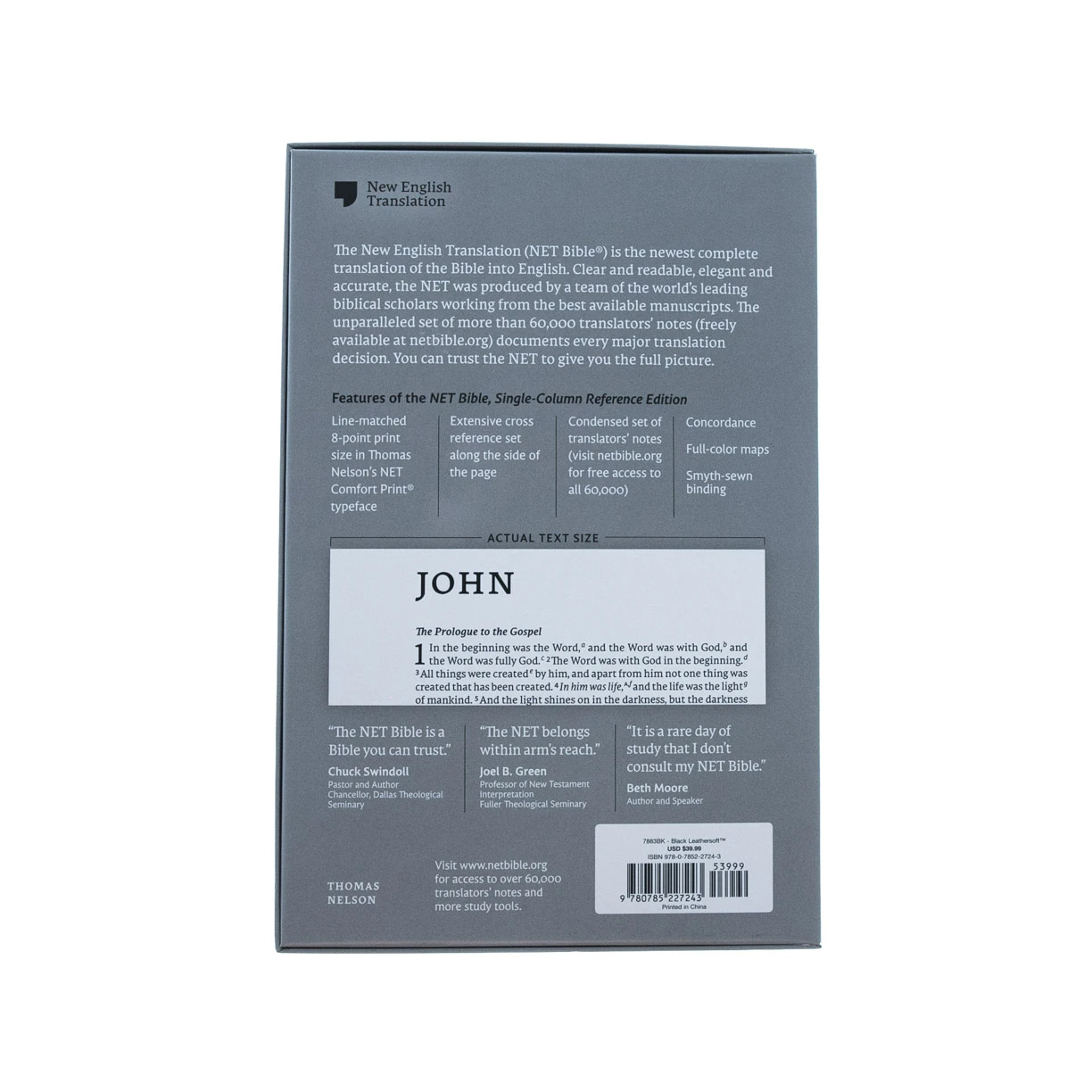 The NET Bible, Single-column Reference Edition, presents the Bible text in a stunning, line-matched single-column format, with extensive cross-references in the roomy margins. Featuring the New English Translation—the newest translation of the biblical languages into English, based on the most up-to-date manuscript discoveries and research—this cross-reference edition of the NET Bible is ideal for students, teachers, and lay-readers alike. Features include:Complete text of the transparent and accurate New English TranslationExtensive set of cross-references help reveal the connections within ScriptureAbbreviated set of NET translators’ notes (complete set of more than 60,000 notes freely available online at netbible.org)Durable Smyth-sewn binding lays flat in your hand or on your deskFull-color mapsThomas Nelson’s NET Comfort Print 8-point typeface