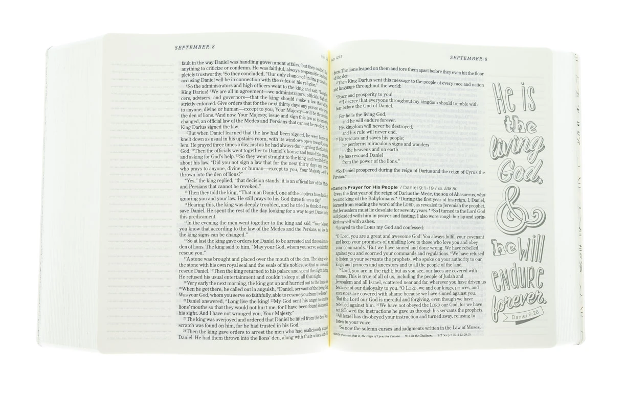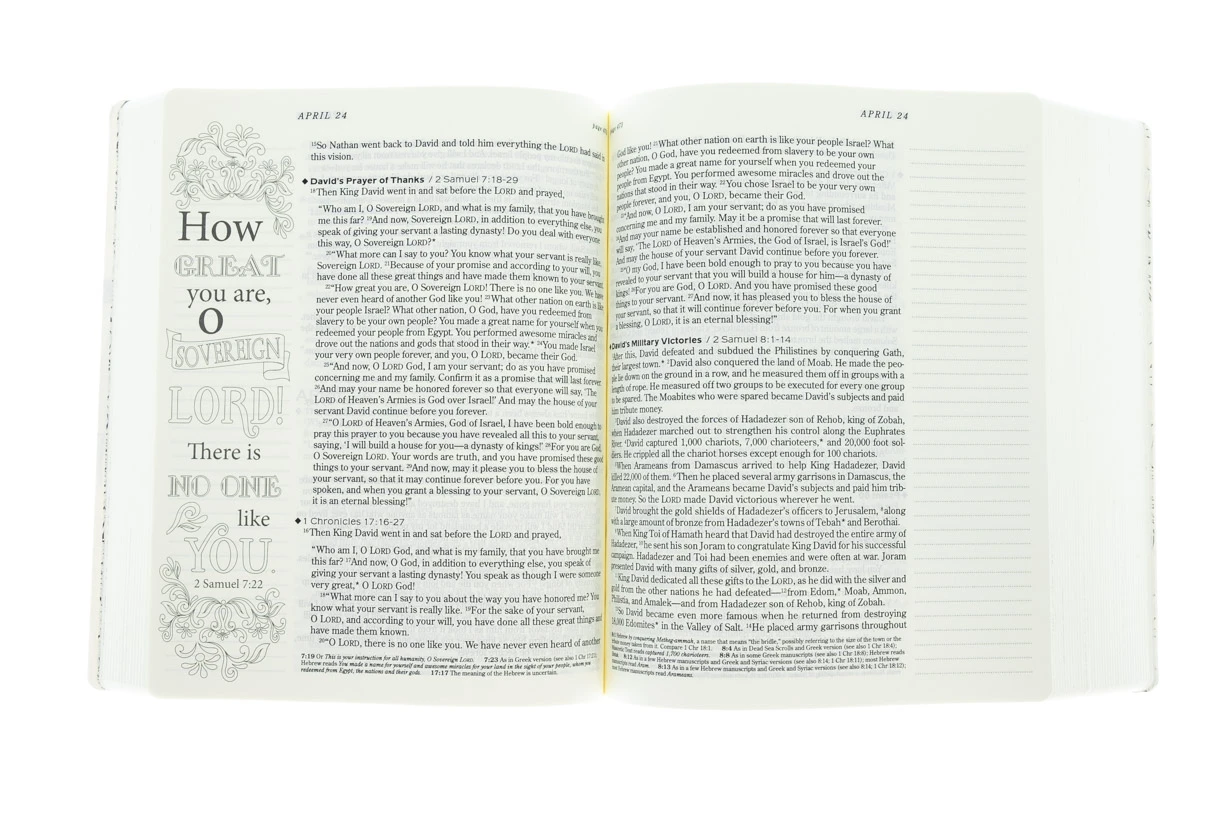 The #1-selling daily reading Bible is more personal than ever with space to read, write, and create! With generous two-inch, lightly-ruled margins and more than 100 artfully drawn verses waiting to be filled in with your most creative ideas, your daily reading experience has never been more personal.The One Year Bible Expressions contains the entire text of the New Living Translation divided into 365 daily readings. Each day’s reading includes portions from the Old Testament, New Testament, Psalms, and Proverbs-guiding readers through the entire Bible in one unforgettable journey that’s easier than ever to make your own.The New Living Translation breathes life into even the most difficult-to-understand Bible passages-but even more powerful are stories of how people’s lives are changing as the words speak directly to their hearts.